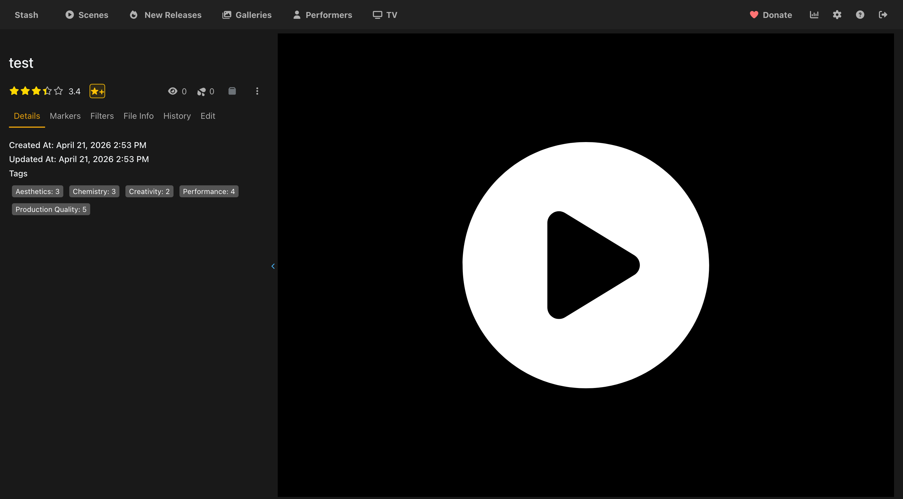 The rating is visible directly on the scene page alongside the category tags that were assigned. The overall rating is the average of all rated categories mapped to Stash’s 0–100 scale.