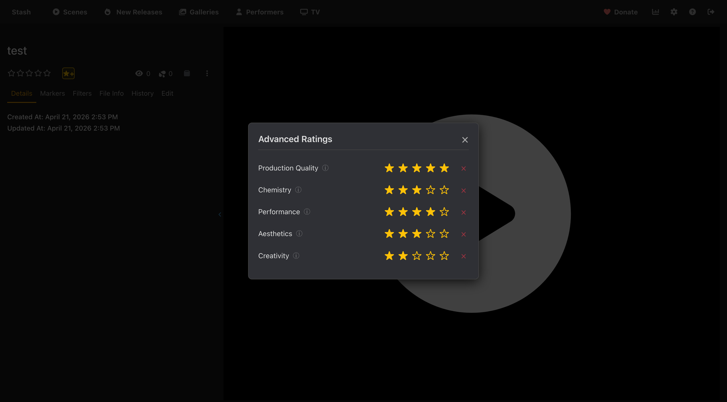 Inspired by the Advanced Rating System plugin on the Stash community forums, which introduced the concept of using tags for multi-category ratings. This plugin builds on that idea with a full interactive UI modal and configurable categories.