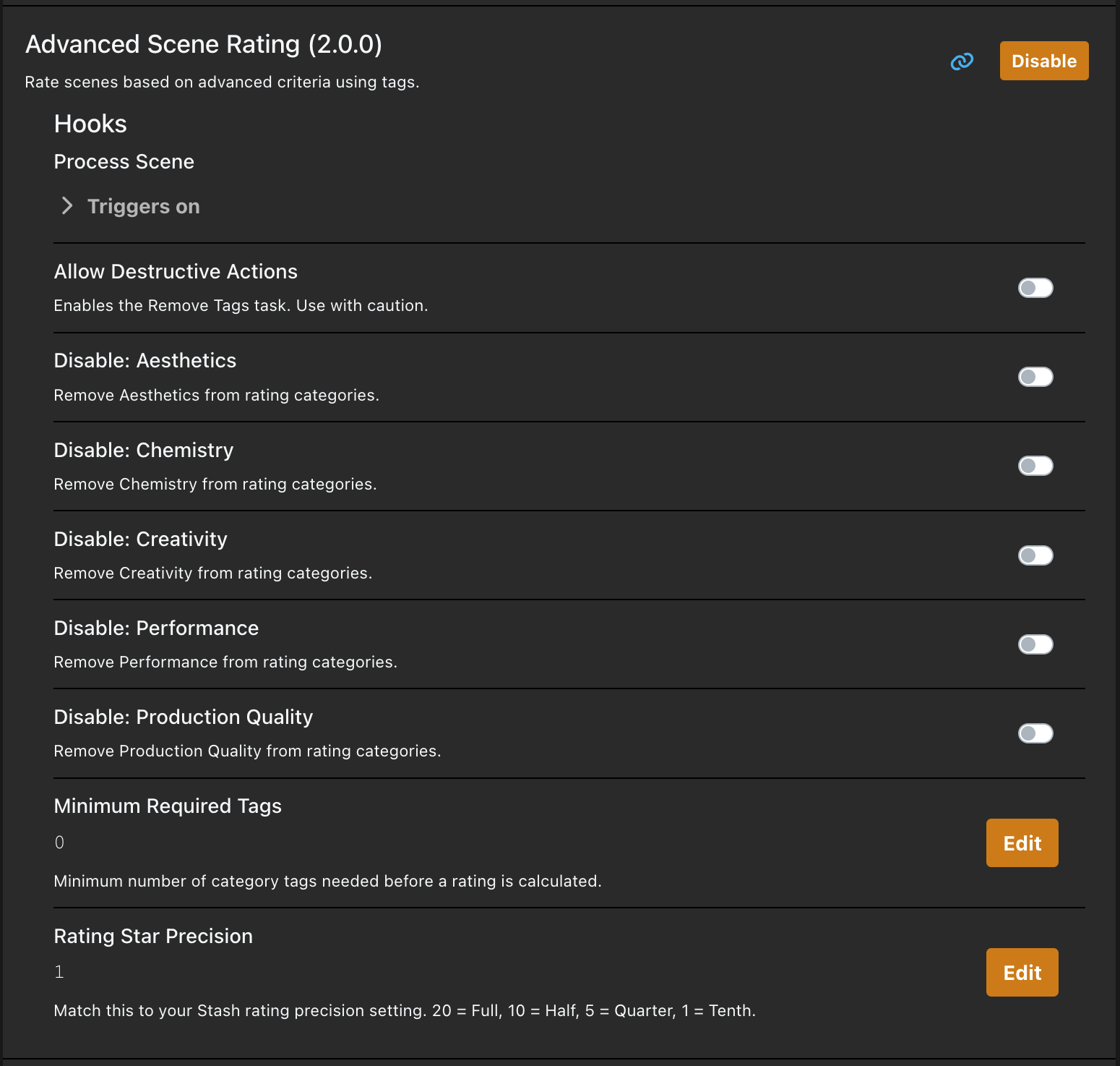 | Rating Star Precision | Match to your Stash rating precision: 20 = Full, 10 = Half, 5 = Quarter, 1 = Tenth (default: 10) |