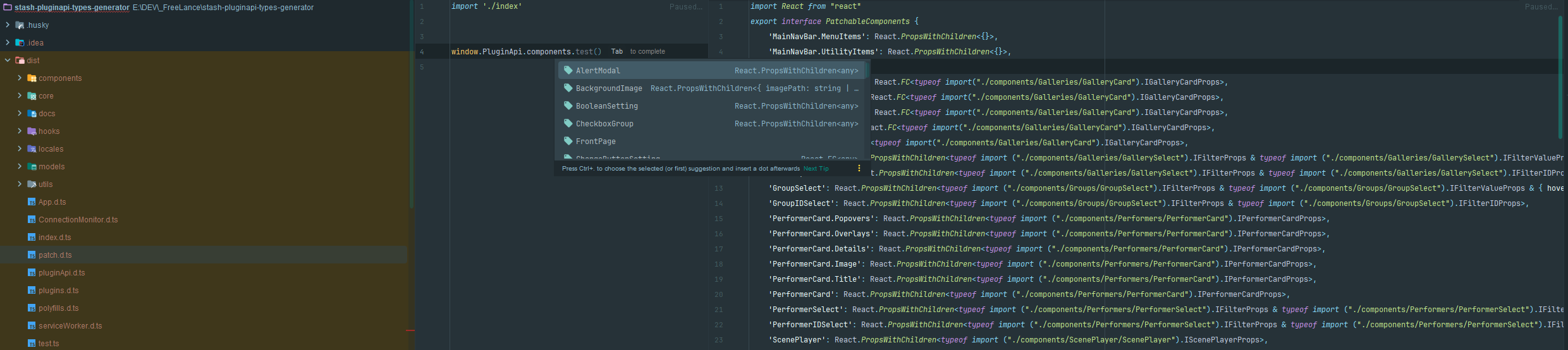 I was able to find all uses of PatchComponent and extract their name as well as correct typing for props. This is just for the PluginApi.components section that will allow proper typing for say the patch namespace method (before,instead,after). With the code I have it would be easy to build out the reset of the typing from the pluginApi.tsx. Still a lot to do but lmk your thoughts. I’m using ts-morph and ts-query to help out with this. Wouldn’t be too hard to make this an automatic generator on say branch pushes and push to say github repo (free).