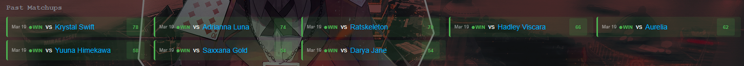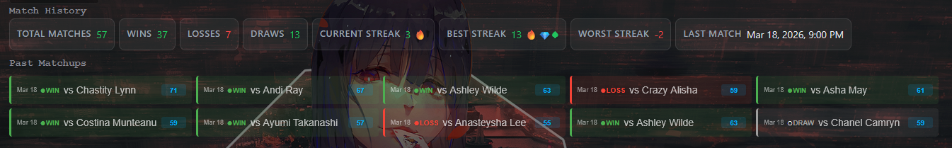 Additional changes coming include performance, leaderboard display, and performer weighting. I am very much a perfectionist so please forgive me if it takes a while. Ultimately I will aggregate the match history add-on and hot or not. But for the sake of my sanity, they will stay separate for now.