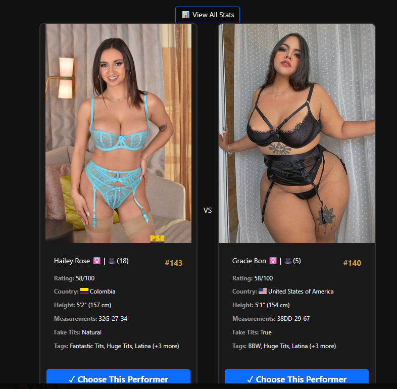 An ELO-based ranking system for performers in Stash. Compare performers head-to-head in an interactive battle interface to build personalized rankings based on your preferences.