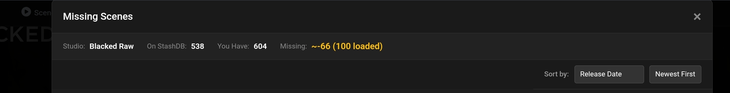 Loving the plugin, but sometimes it seems to return inaccurate numbers. For example, visiting the Exploited College Girls studio on StashDB shows 1,173 scenes, but clicking the “Missing Scenes” button in Stash only shows 394 scenes. Am I missing something?