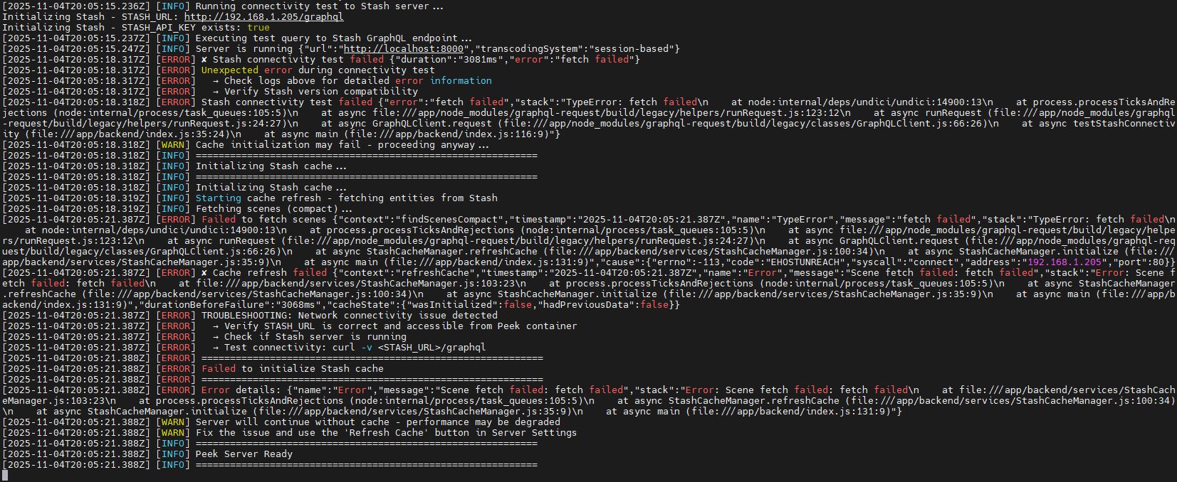 [2025-11-05T17:43:56.863Z] [ERROR] → Verify STASH_URL is correct and accessible from Peek container