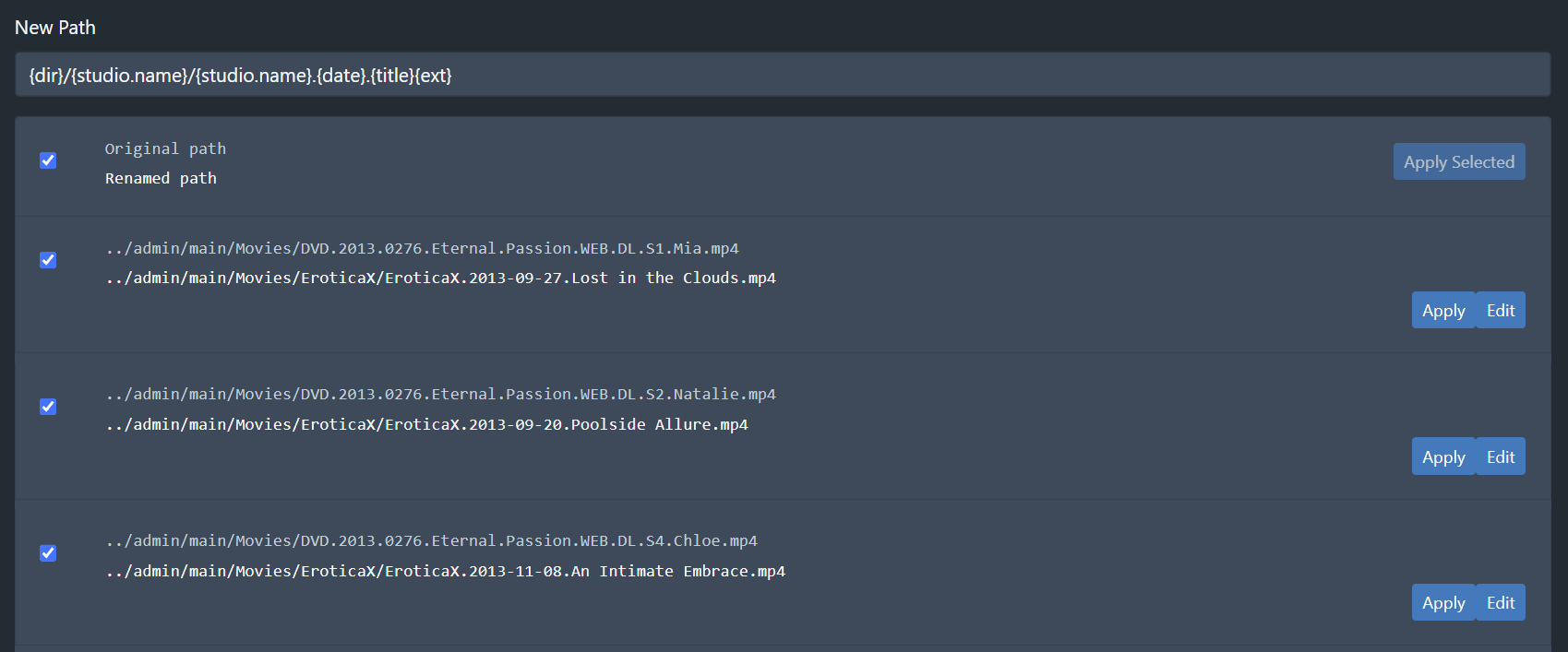 There are buttons to select multiple scenes and apply the change, but these are currently non-functional. A backend javascript script can be implemented fairly easily to run a batch rename for a selection of files, or applied based on a filter.
