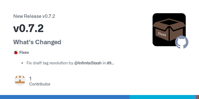 - Fix draft tag resolution by @InfiniteStash in Fix draft tag resolution by InfiniteStash · Pull Request #989 · stashapp/stash-box · GitHub