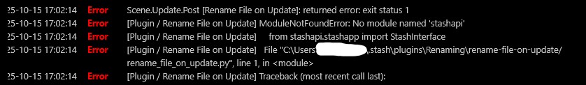 2025-10-27 22:58:11Error [Plugin / Rename File on Update] ModuleNotFoundError: No module named ‘stashapi’