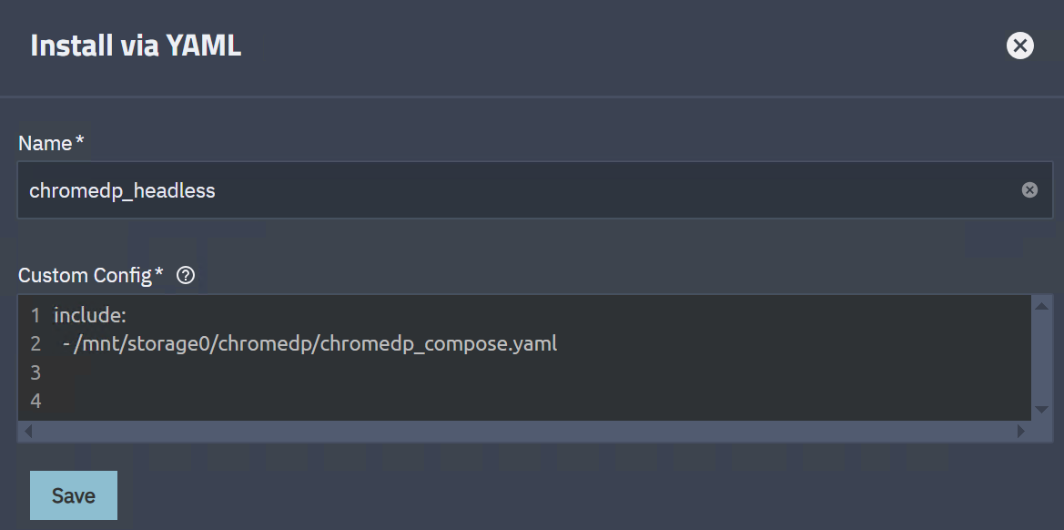 save these content into a compose file - let’s name it chromedp_compose.yaml and put it to TrueNAS directory: /mnt/storage0/chromedp/chromedp_compose.yaml