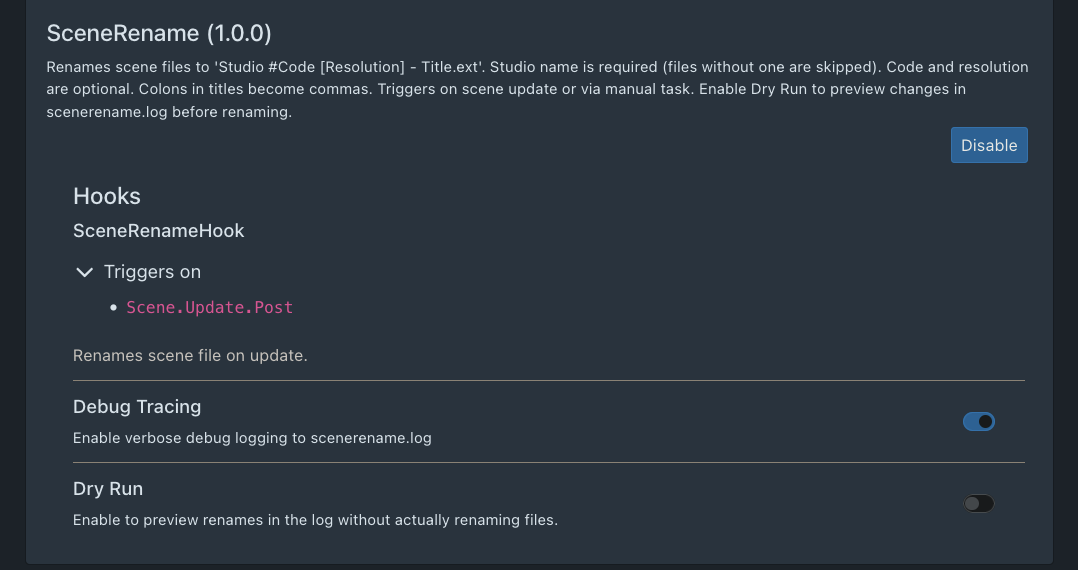 | Summary | Renames scene files to ‘Studio #Code [Resolution] - Title.ext’. Studio name is required (files without one are skipped). Code and resolution are optional. Colons in titles become commas. Triggers on scene update or via manual task. Enable Dry Run to preview changes in scenerename.log before renaming. | |