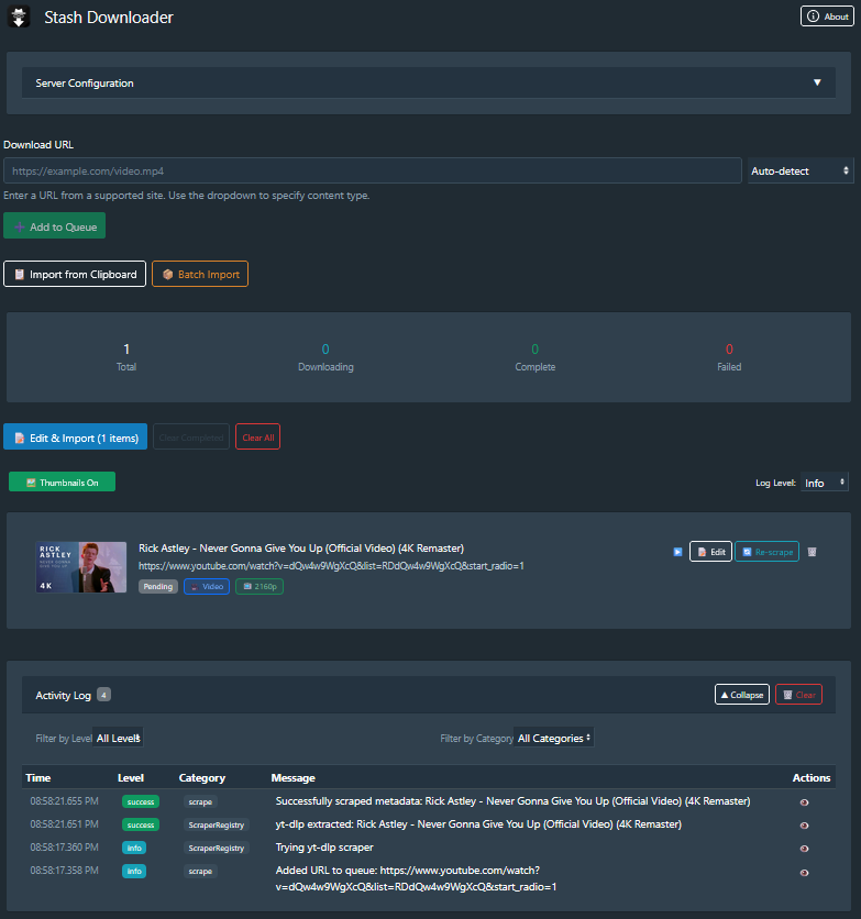 This is amazing, thank you! Is there an opion to automatically “Import” so I don’t need to wait for the edit box to pop up when I batch add links? As it stands, I can add a bunch of links with the batch import, but I need to wait for each link to be downloaded and then click the “Import to Stash” button for each new link in the same batch. I hope that makes sense. I’m on 0.4.2