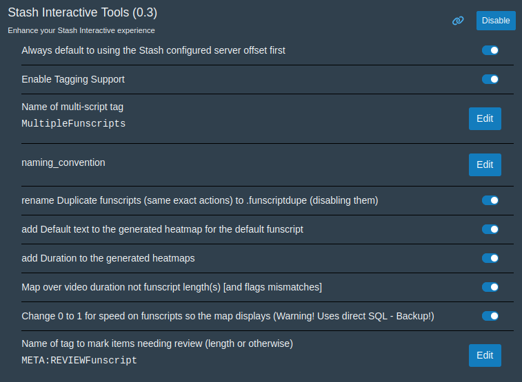 | Summary | Stash Interactive Tools offers enhanced functionality, including customizable sync offsets, adjustable stroke lengths, support for multiple funscripts with heatmap integration, and compatibility with ivdb tokens for filescripts and URLs. | |