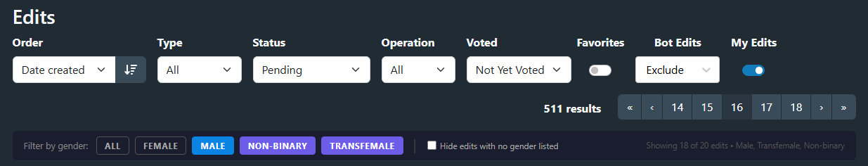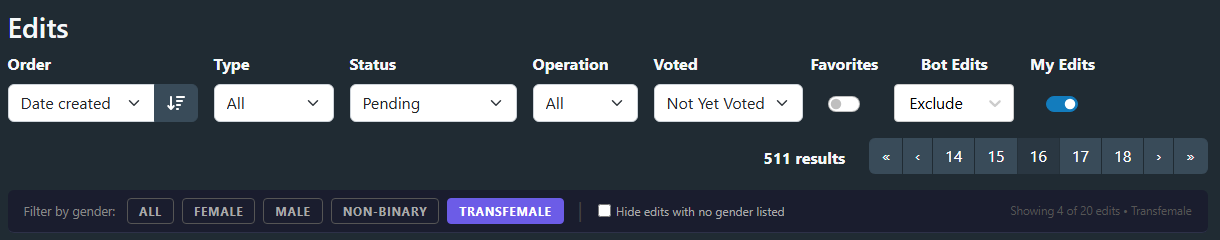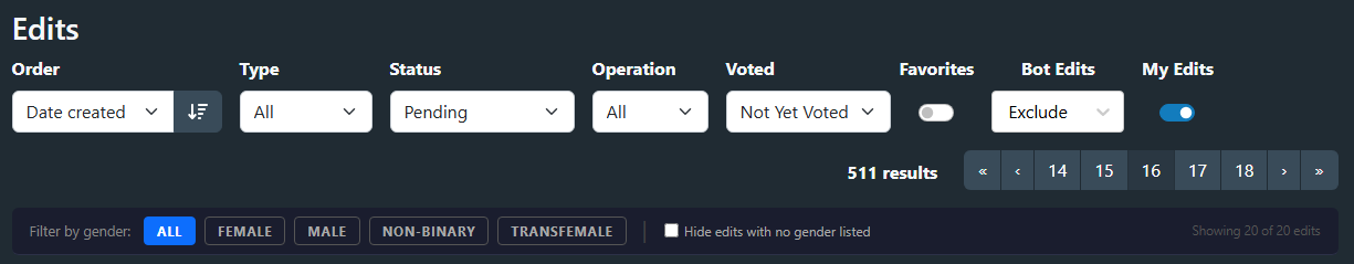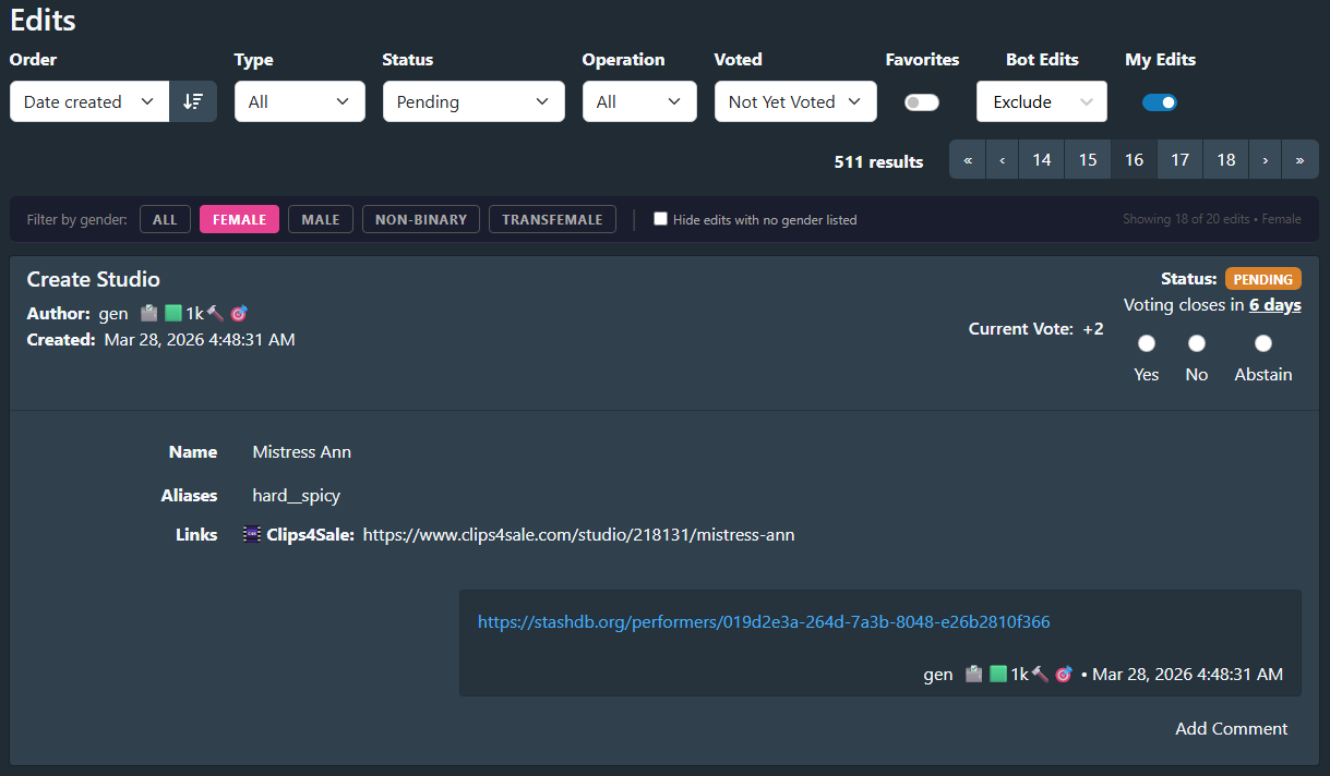 The StashDB edits page (/edits) shows all pending, accepted, and rejected edits in a single stream — scene edits, performer edits, studio edits, tag edits, all mixed together. If you want to focus on edits involving performers of a particular gender (e.g. reviewing only scene edits that include female performers), there’s no built-in way to do it.
